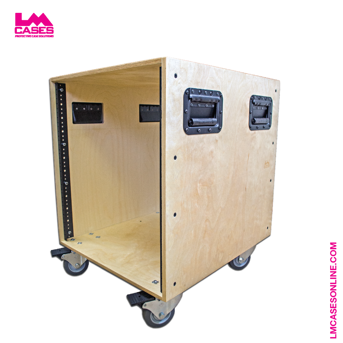 The rack is built from ½” Baltic Birch plywood. The dove tail corner joints are exposed and add an industrial aesthetic, perfect for any studio or production décor. The rack features 4 HD black Penn deep recessed handles. Four soft rubber 3.5” casters are provided for easy transport. The soft rubber is safe for all floors and is non marking. The front 2 casters lock to keep the rack in place during use.