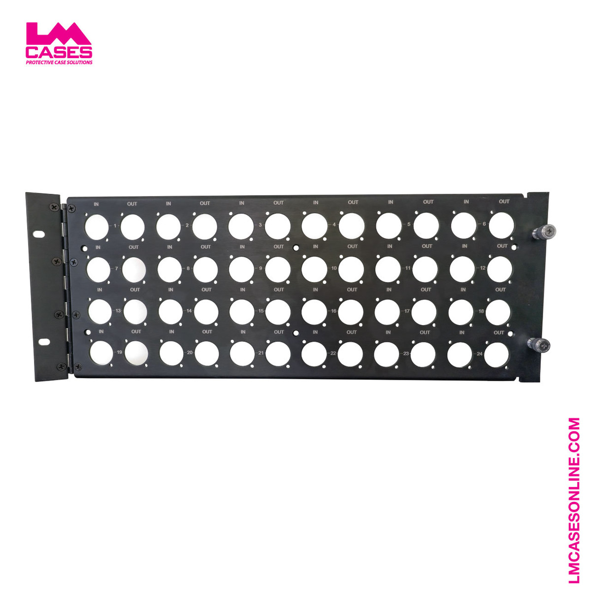 This custom 4U mic split panel is designed for the engineer who would prefer to build their own system. The panel comes pre-punched with 48 holes for XLR connectors. The panel is labeled 1-24 with “in” and “out” over each corresponding hole. The panel also comes with lacing bars that are designed to attach via standoffs to the back of individual connector’s screws.