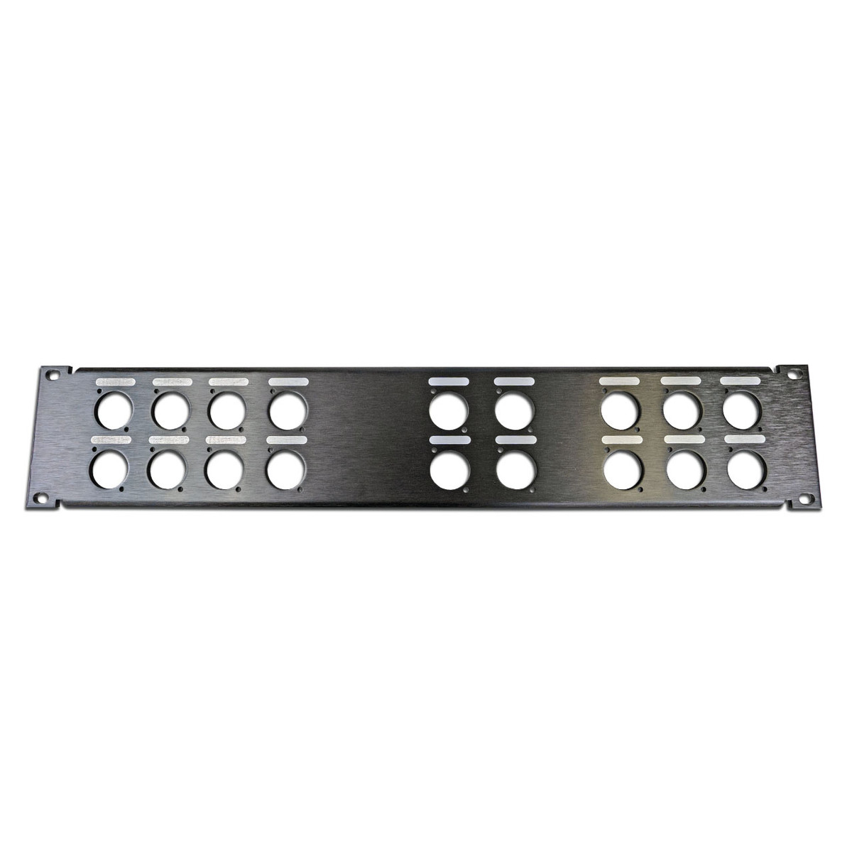 The LM Tour Systems Generic 18 punch panel is designed for installs and dynamic applications where a heavy duty rack panel is required. The panel features generic bubbles over each punch allowing users to write labels in or provide a specific place to attach a label. The panel is 2U in height and is built from .125” thick brushed aluminum that is black anodized. Support flanges are bent into the panel for additional support and to prevent bowing. This is a tour grade panel designed for heavy duty applications.