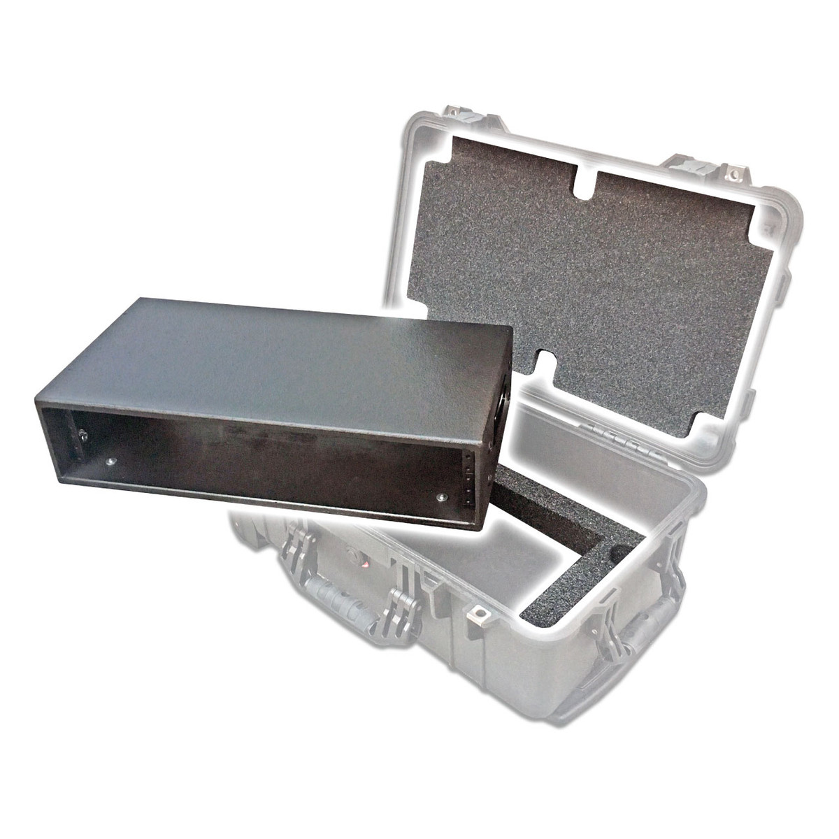 This custom foam and rack set built by LM Cases are intended for users who already own a Pelican 1510 case and wish to outfit it with a 2U rack. This set is perfect for touring professionals who need to carry 2U worth of rack gear on a commercial flight. The rack is specially designed to fit within the Pelican 1510. The rack is built from ½” Baltic Birch plywood, finished with black textured coating and featured front and rear pre-tapped 10-32 rack rail. The rails are recessed ½” from the front and rear of the shell. Rail to rail measures 9.25”. A 1” Ester foam top pad is included, and features cut outs for the special application stud mounts in the lid of the 1510 case. A 1.75” PE foam bottom pad is included for under the rack. This foam insert accommodated the wheel and handle intrusions. It also provides 4 holes for the feet of the rack shell to lock into. The bottom PE pad features a 13.625” x 8.375” cut out to provide an accessory compartment under the rack.