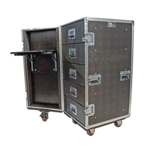 The LM Cases 5 drawer workbox with hinged front lid is the perfect addition to any mobile production. Designed around standard truck packs, this workbox will be at home in any audio, video, or lighting application. The outer case is built out of ½” plywood laminated with your choice of ABS plastic colors. Each drawer is built out of ½” Baltic Birch and is mounted on HD Accuride drawer glides. The drawers feature a ½” plywood face with a recessed handle as a pull. All drawer edges are routed. The drawers are coated with clear lacquer inside and out.