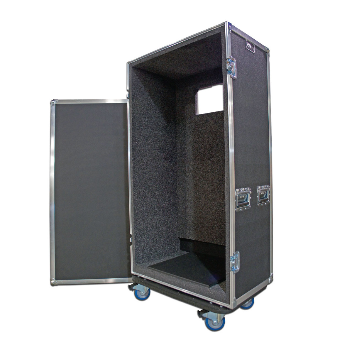 The case interior is lined with 1” PE foam. 2” PE foam is positioned under the speaker cabinetxfor additional shock protection. A ½” black marine grade plastic top board is laminated to the 2” PE foam under the cabinet. This top board allows the cabinet to be loaded/unloaded easily. It also prevents the cabinet’s wheels and feet from digging in and tearing the foam. A trap door is located on the back of the case to fully expose the input jack panel on the speaker cabinet.