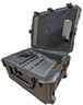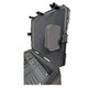 The console is held in custom cut, PE foam insert. The insert features inset nonabrasive Crosslink foam that touches the top of the monitor. It also features a Crosslink block that extends from the lid to trap the console at its wrist rest. This protruding block is necessary due to the unique shape of the console. The bottom of the insert features 4 cut outs to accommodate the console’s feet. A 10” wide x 8” deep x 3” tall accessory compartment is located under the console to hold its power cable, light and other items. The foam insert is mounted in a waterproof SKB iSeries case.
