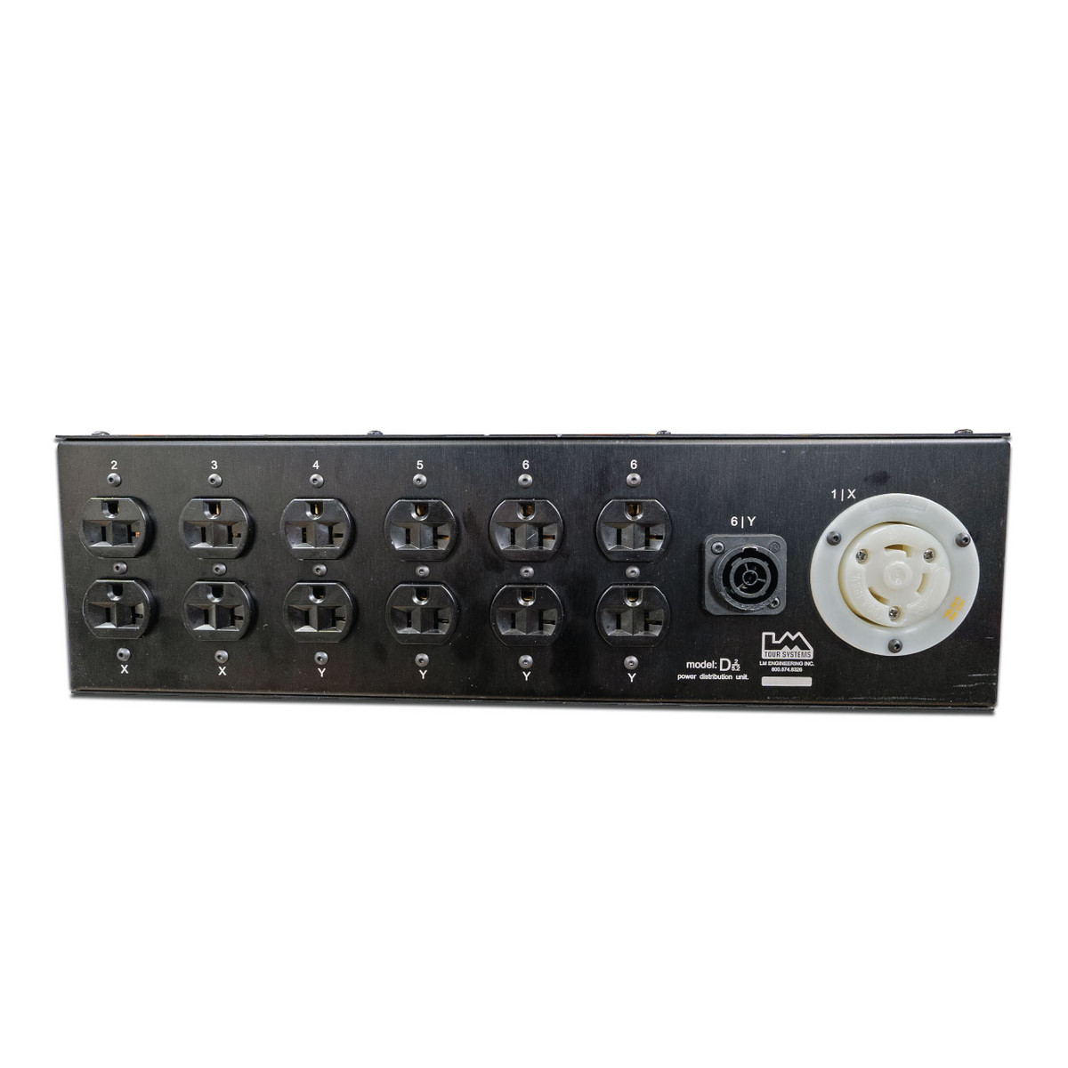 The D 2/5.2 50 Amp distro built by LM Tour Systems is intended for audio visual productions. The distro features a 50 amp “Cali” inlet and outlet. The inlet and outlet are wired together pre-breaker for linked applications. 2 hot legs are denotated as “X” and “Y”. Indicator lights are located by the power inlet to show when voltage is present on the input side for troubleshooting. Separate meters showing voltage and amperage draw are provided for each leg. A front mounted courtesy outlet is provided and features a dedicated 5-amp breaker and USB A & C charge ports. 6 front mounted breakers are provided. Each breaker is numbered 1-6 and corresponds to an outlet(s). The breakers also note the hot leg (X or Y) below them. The rear panel features 6 Edison outlets, a True1 outlet and a L5-30 twist lock outlet. 4 of the Edison outlets are dedicated 20-amp circuits. Circuit 6 handles the front mounted courtesy outlet, 2 rear duplex outlets and the True1 outlet. A dedicated L5-30 twist lock outlet is provided for higher drawing items such as power amps.