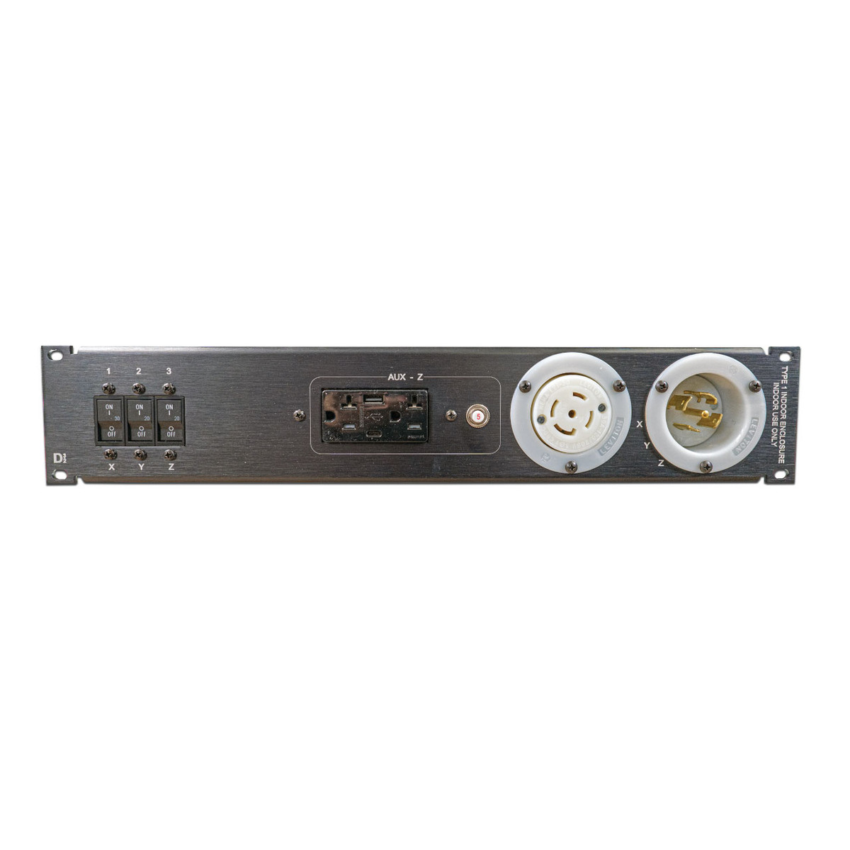 3 hydraulic breakers are provided as master switches over the system. 2 – 20-amp breakers are provided over the Y and Z phases with a dedicated 30-amp breaker over the X phase which powers the rear mounted L5-30 outlet. The only outlet on the X phase is the Hubbell HBL2616 which is designed for large amplifiers or other 30-amp sources.