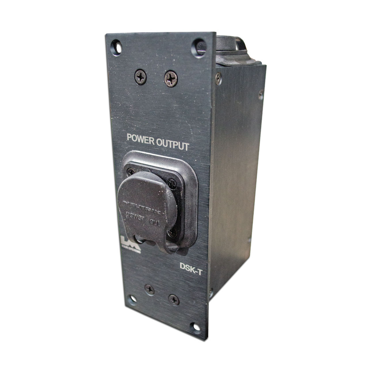 The LM Tour Systems DSK-T is designed to provide linkable courtesy power outlet to a work surface. The power box is fed via its NAC3MPX-TOP inlet. LM Tour Systems True1 power cables are custom built to length as an option. The boxes are designed to link together should a system require additional power outlets. Each True1 outlet includes a SCNAC-FPX rubber sealing cover for protection when not in use. The box is constructed out of .125” thick brushed aluminum that is black anodized.