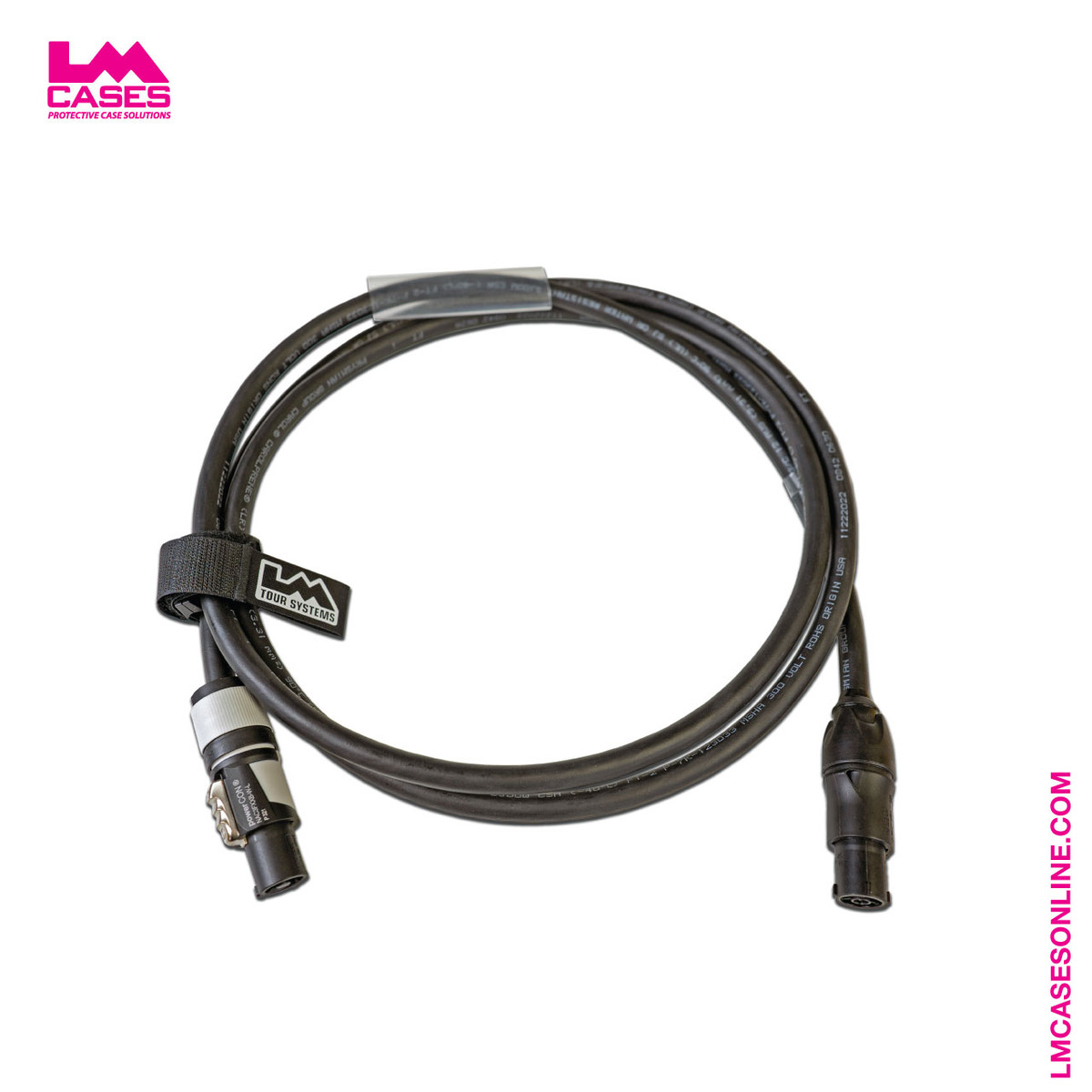 This heavy-duty, custom-built cable is designed for portable and installed applications. Your cable is built per order to the length of your choosing. The cable is built from HD 12awg 3 conductor SO cable. Each end is terminated with a Neutrik NAC3FPX-W-TOP and NAC3FXXB-W-L connector. Also included is custom heat shrink label with the text of your choosing. The cable includes a 4.5” clear heat shrink piece for additional labels and a LM Tour Systems branded Rip Tie Velcro cable tie.