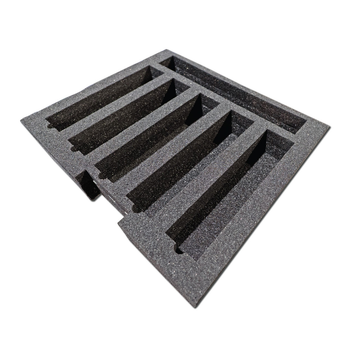 This custom rack drawer built by LM Cases is design to hold 5 Shure Axient AD2 hand held wireless microphones. The insert features 5 individual compartments and 1 accessory compartment for general storage. The insert is mounted in a Penn Elcom Tour Grade rack drawer that is 2U tall & 14” deep.